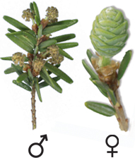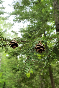 Les cônes mâles de la pruche passent souvent inaperçus, ils ne mesurent que 2 à 3 mm! Si on y prête attention au printemps, on peut les apercevoir, semblables à de minuscules framboises blanc crème. Ces petites sphères globuleuses sont suspendues à l’arbre par un fin pédoncule.