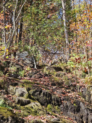À chaque détour, le sentier évoque les échos du passé et offre une plongée fascinante dans l’histoire. On y trouve notamment des traces laissées par l’ancien moulin de la seigneurie d’Ailleboust. Le chemin mène à une chute d’eau, à sec en cette saison automnale, qui alimentait la roue d’un moulin à scie. On y voit encore des éclats de pierres cimentées, vestiges d’un canal qui permettait autrefois de diriger l’eau vers la roue. Ces restes nous rappellent combien le Québec est issu du monde forestier qui a façonné notre identité.